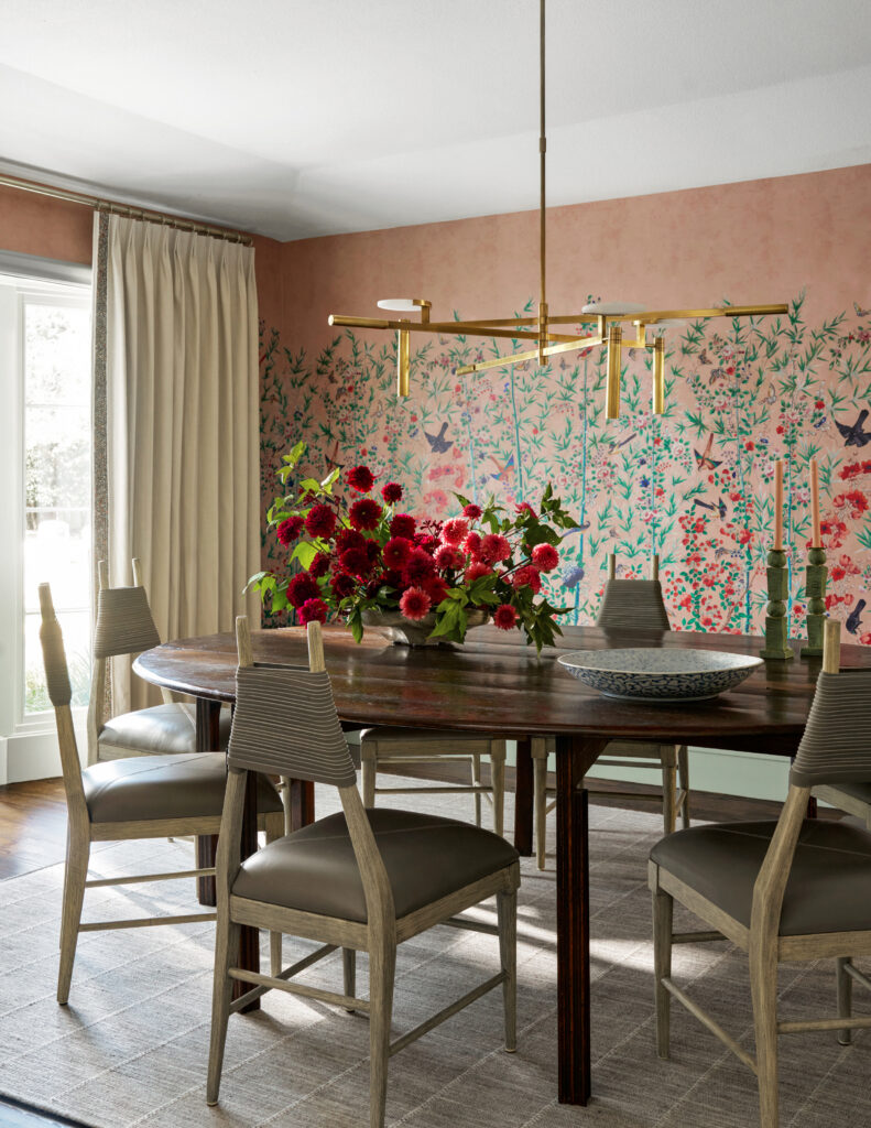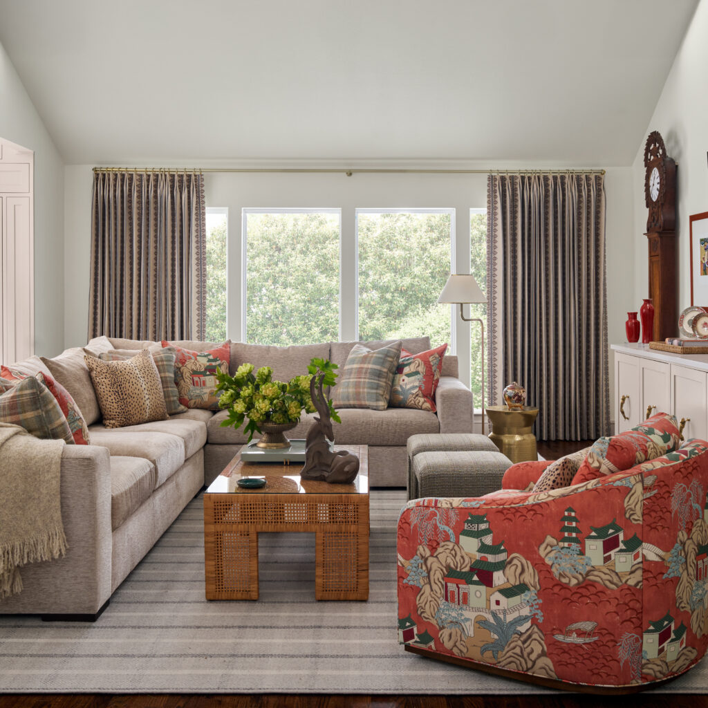 One of the project’s standout achievements lies in our use an assertive color — one that might overwhelm in other hands — with restraint and elegance. Splashes of tomato soup red are strategically placed to create visual rhythm without overpowering each space. Each room flows effortlessly to the next, guided by thoughtful furniture placement, cohesive materials, and thoughtful layering of texture, pattern, and tone.